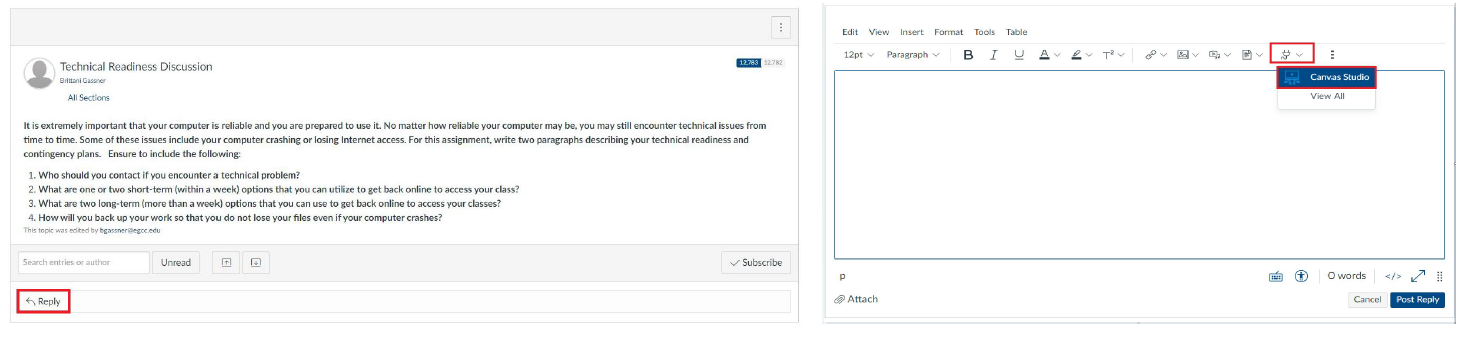 Step 3: At the bottom of the Discussion assignment post click the reply button. A text box tool will open below where