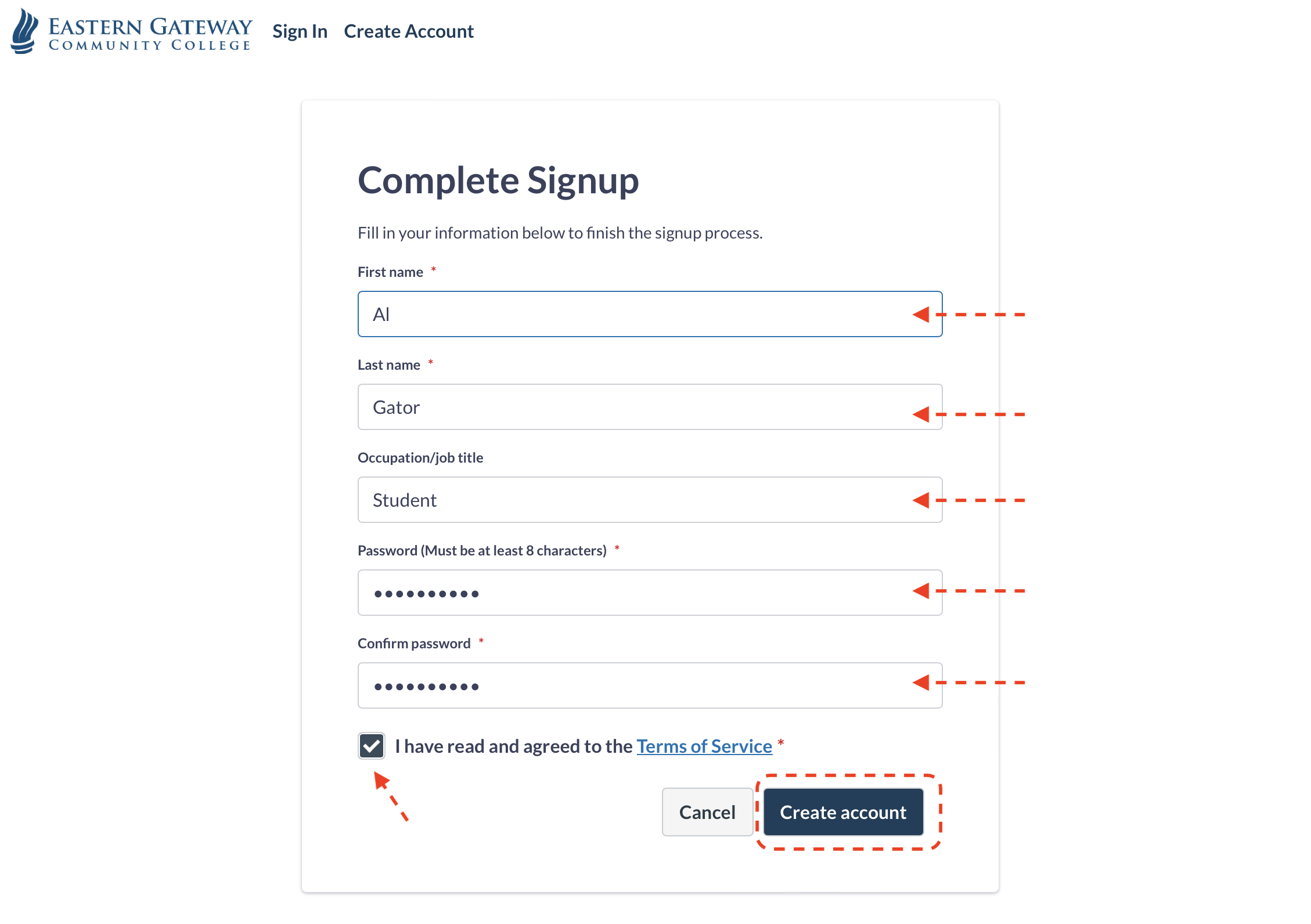 6) Finish entering your information and select a strong password. Accept the terms & conditions and then click the 'Create account' button to finish the account setup.