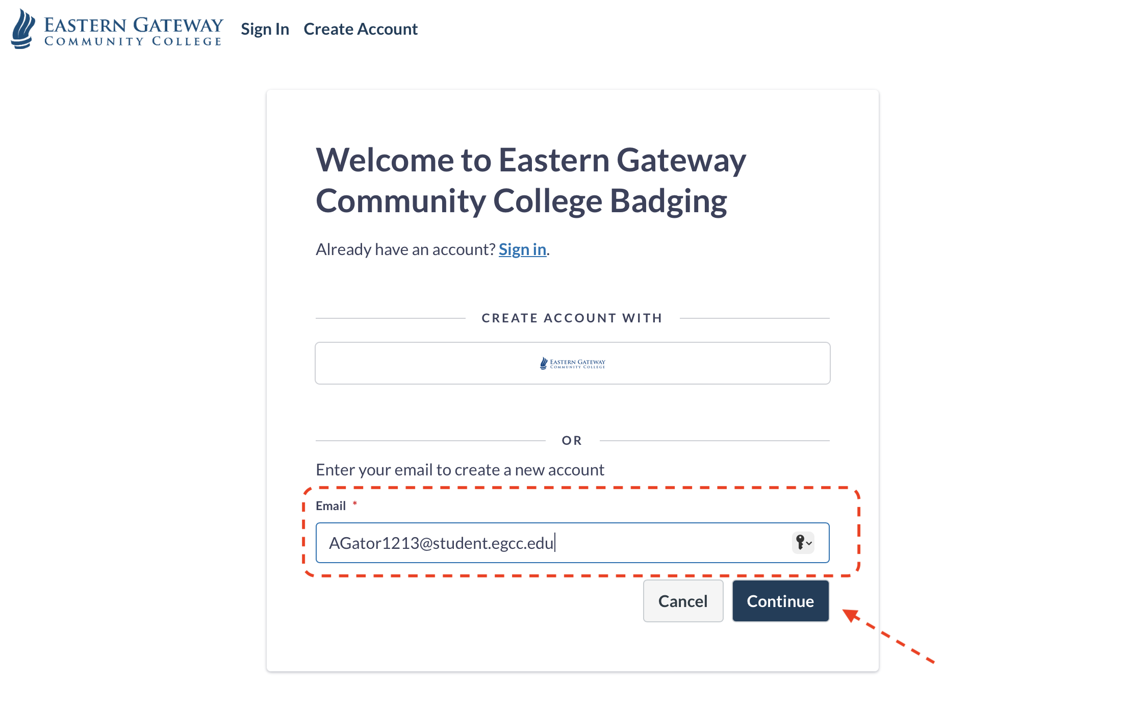 3) You will be redirected to the Badgr website with a prompt to sign-in or create an account. Enter your school email address and click on Continue. Note -- You MUST enter your school email address, not a personal address as your badge is assigned by your school email address.