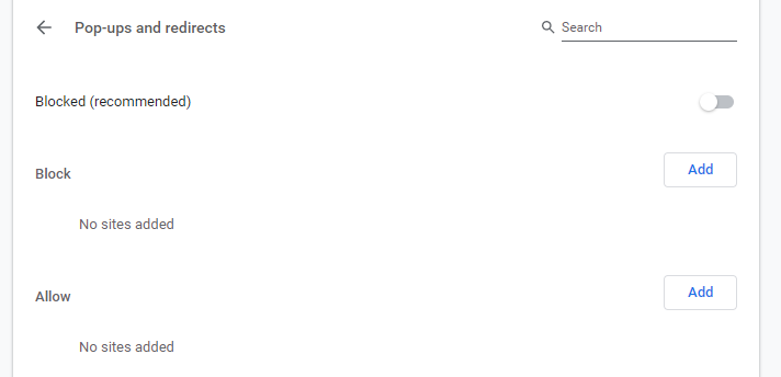 Step 6. In the "Pop-ups and redirects" section, turn the setting to Allowed or Blocked(Recommended). Customize permissions for specific websites by clicking Add under both the Block and Allow sections.