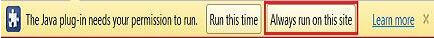 - Click Always run on this site to allow Java to run on all the site's pages. You will not see this message again for pages on the site you allowed.