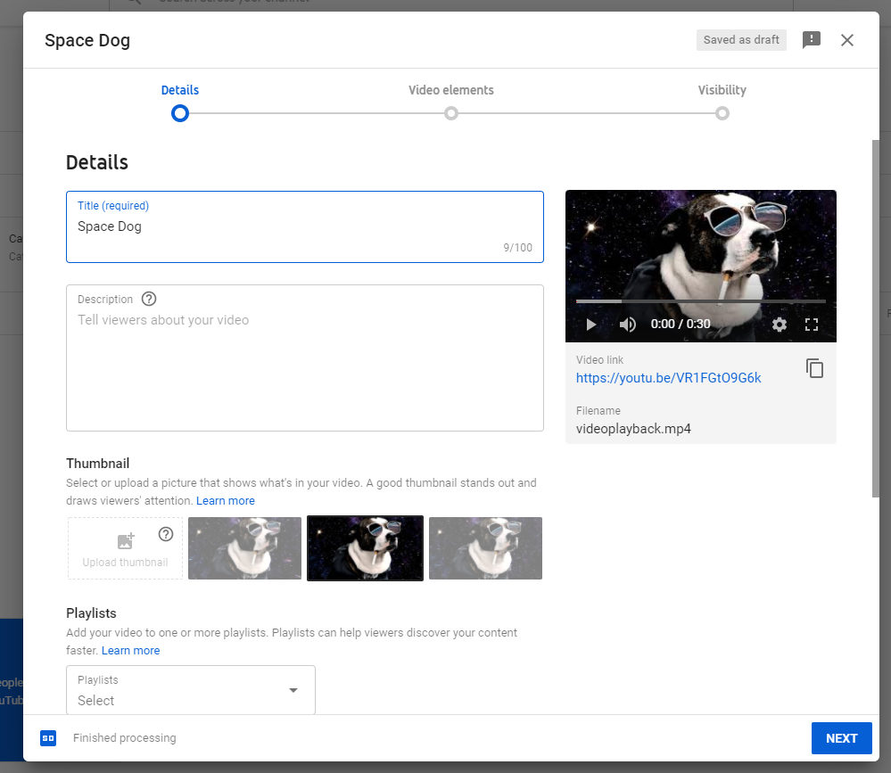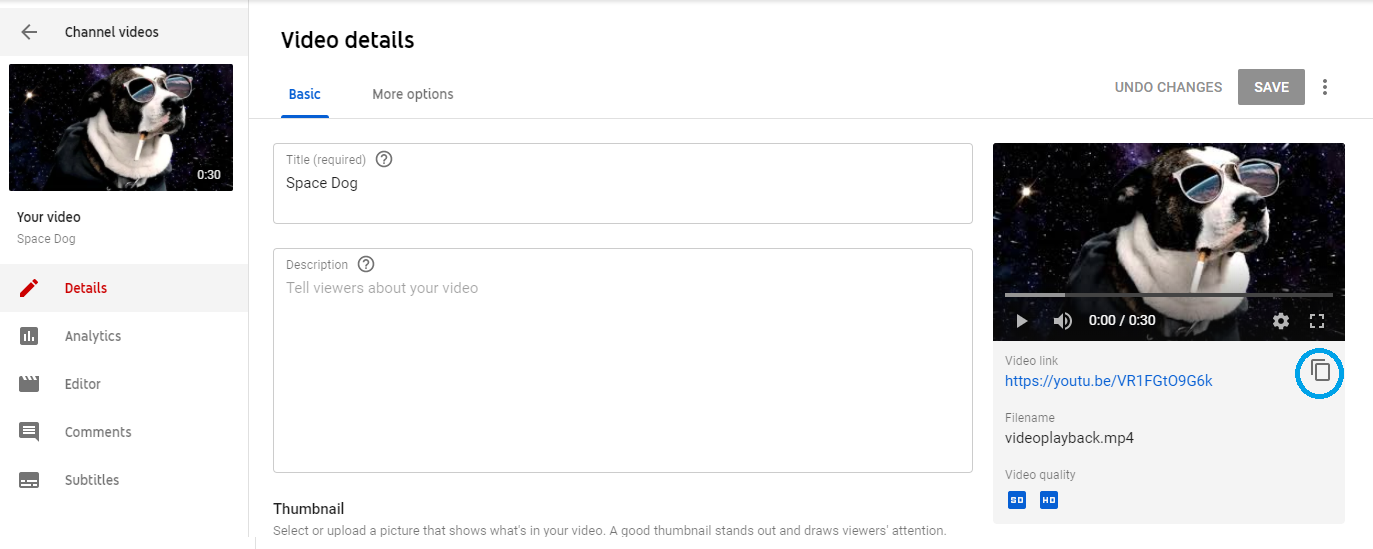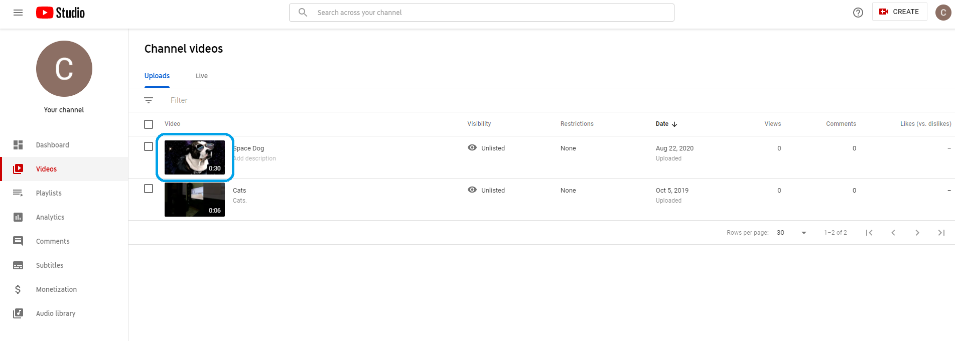 You will now be taken to your list of uploaded videos. Click on the thumbnail of the video that you've uploaded to pull up its information screen.