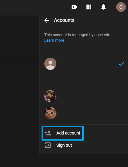 Click on that, and click on Switch Account. Click 'Add Account,' and enter your EGCC student email and password, the same information you use to sign in to the Student Portal.
