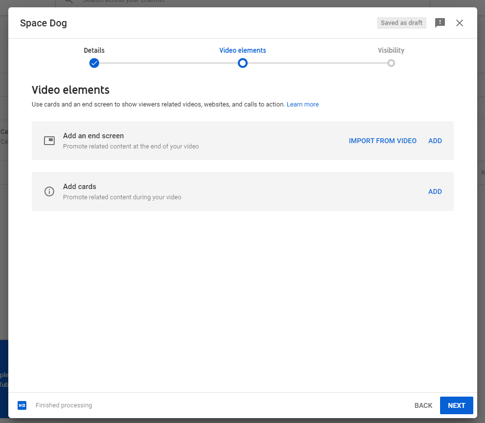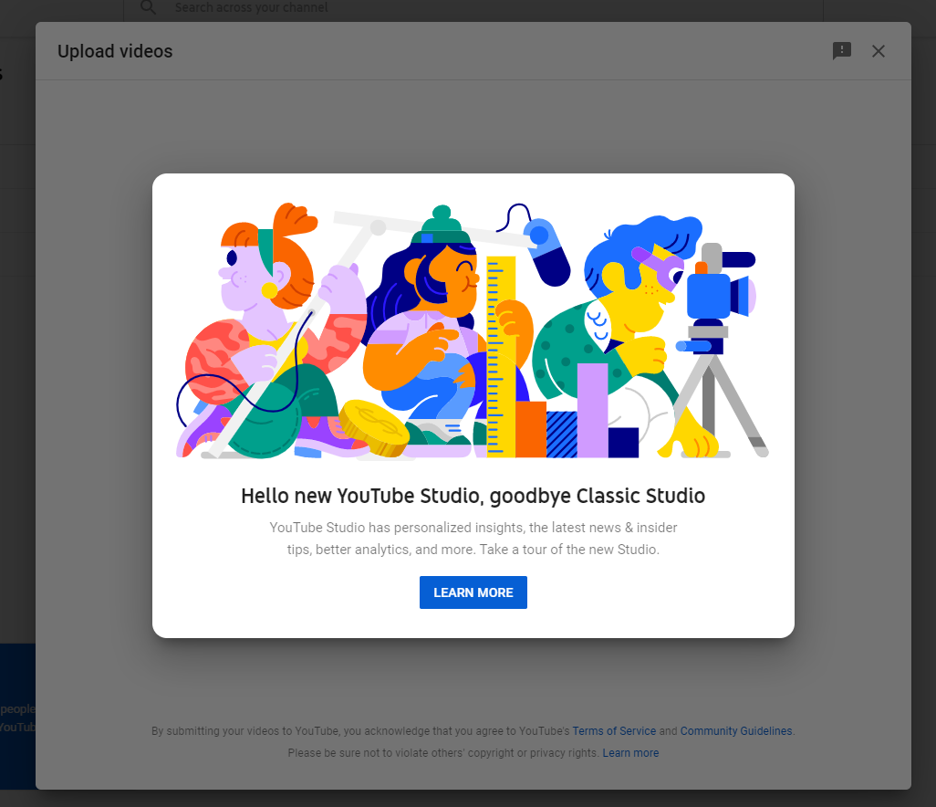 You will be met with this panel (if you don't see this panel, click on Create on the top right, and Upload Videos):