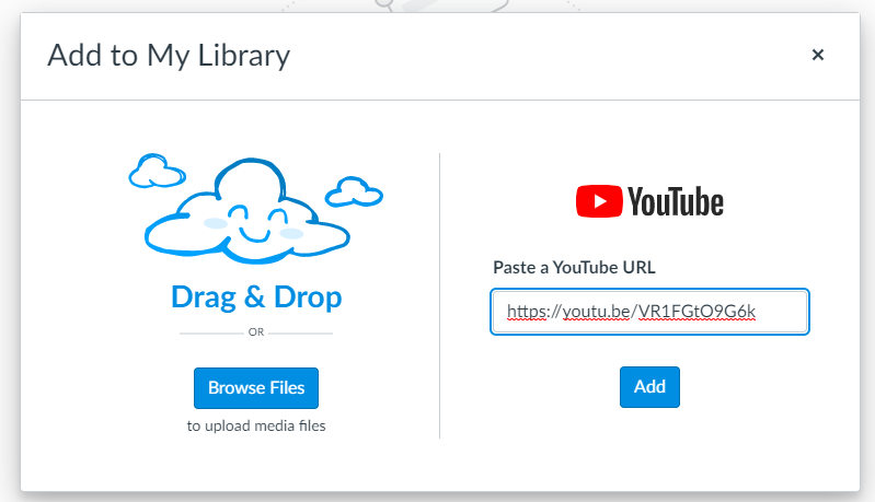 From inside Canvas Studio, click Add on the top right, and paste the copied YouTube video URL into the box on the right. Click Add.