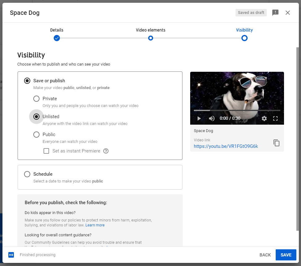 In the Visibility window, select either Public (your video will be visible in search on YouTube), or Unlisted (only those with the link can view the video) - the choice is yours. Click Save.