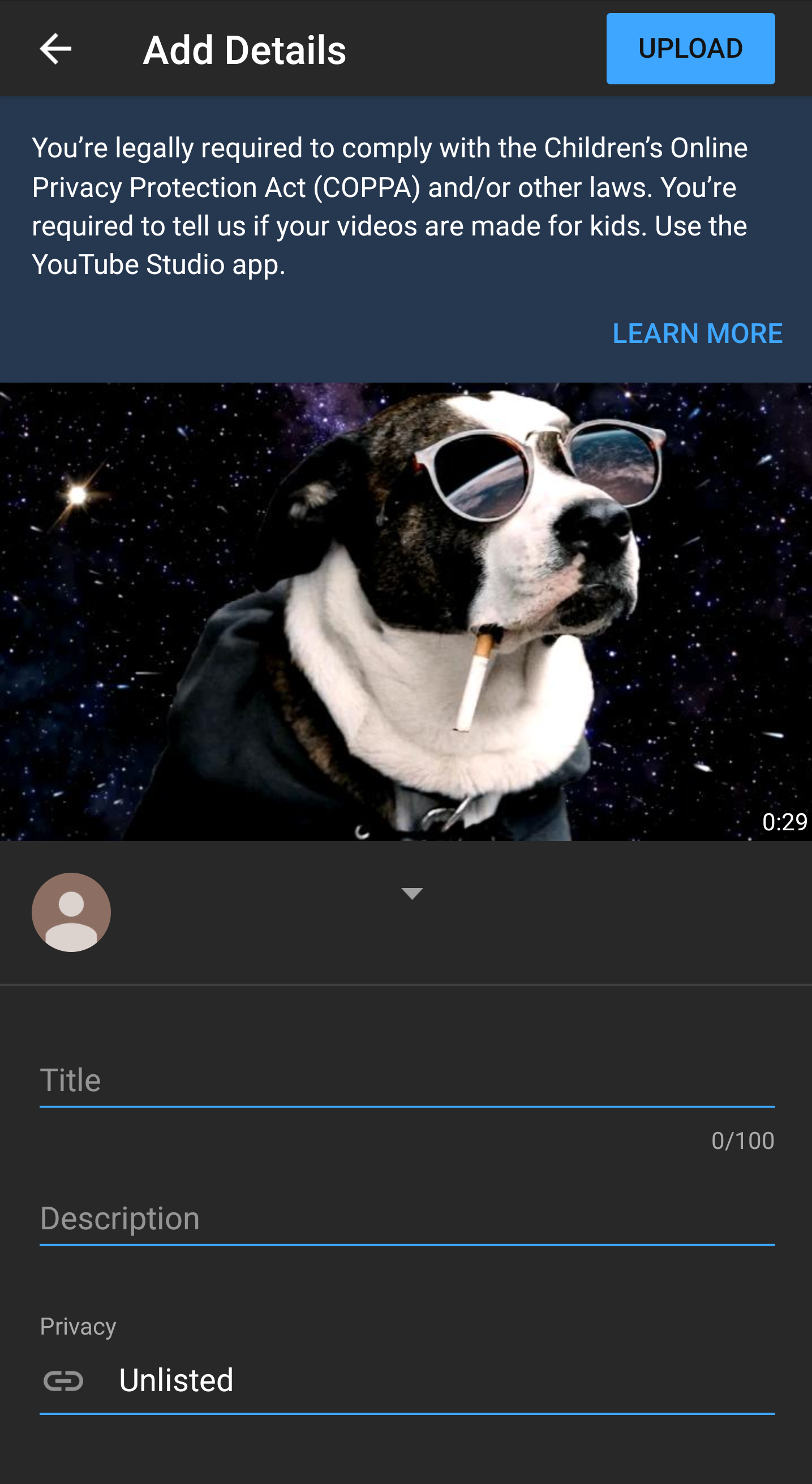 Here, you can add a title and description to the video, but it's not important for transferring to Canvas, so it's up to you. If you don't name the video, YouTube will just name it whatever the current date is. If it's not already, set the Privacy to 'Unlisted,' which means only those with the link can view your video, and it won't appear in search. Tap Upload when finished.