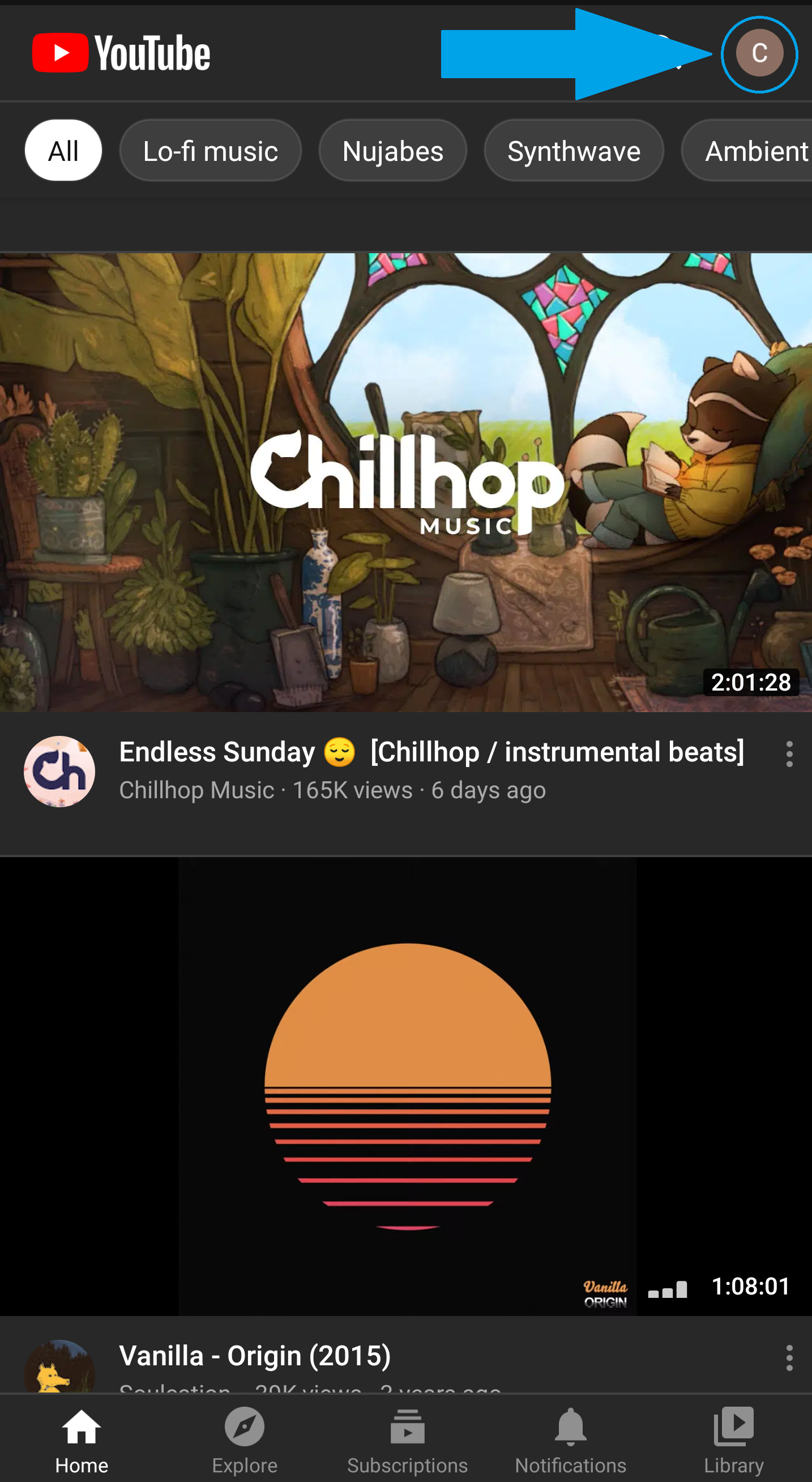 First, open up your YouTube app on your mobile device. On the top right of your screen, tap the account icon, which will be either a circle with your first initial, or your profile picture.