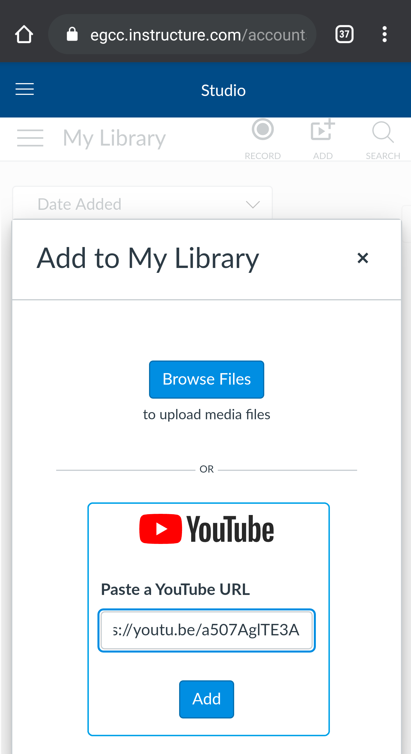 In Studio, tap Add on the top right, and paste the copied URL for your video into the box underneath YouTube