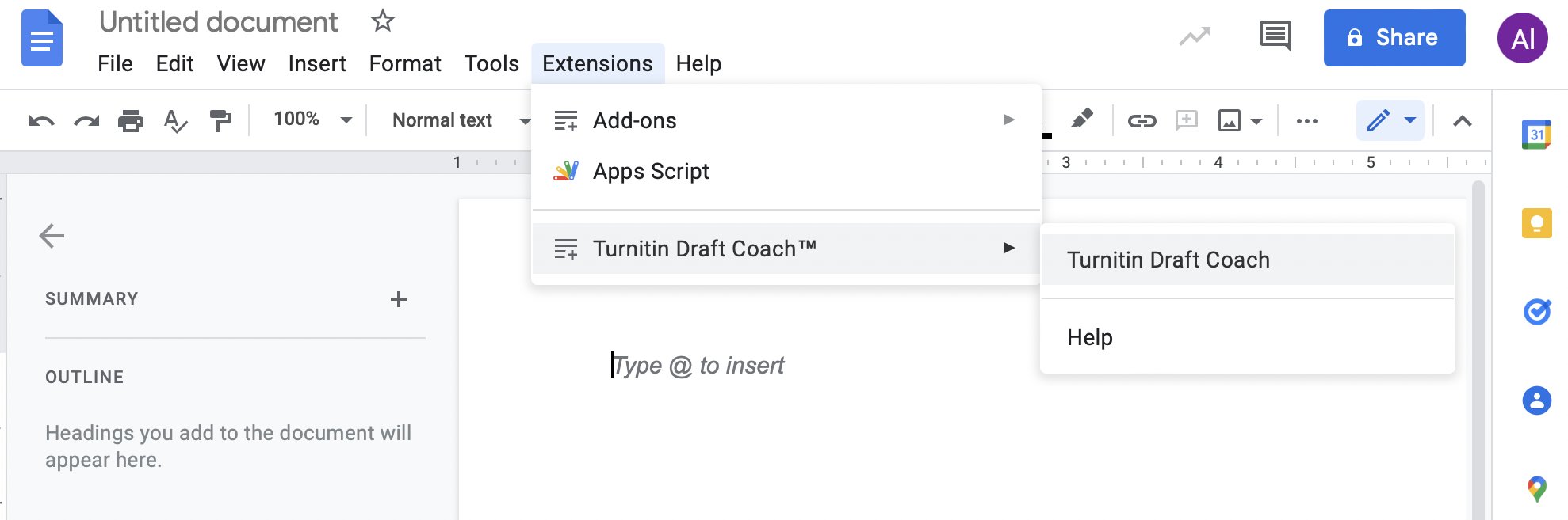 On a Google document, choose Extensions and Turnitin Draft Coach > Turnitin Draft Coach.