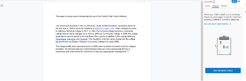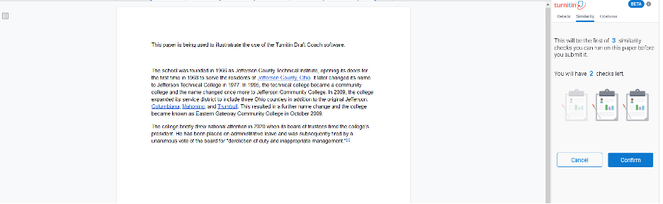 Draft Coach allows 3 Similarity Checks on a paper. It will display which of the 3 similarity checks are being used and how many are left. To use one of the checks, choose Confirm.