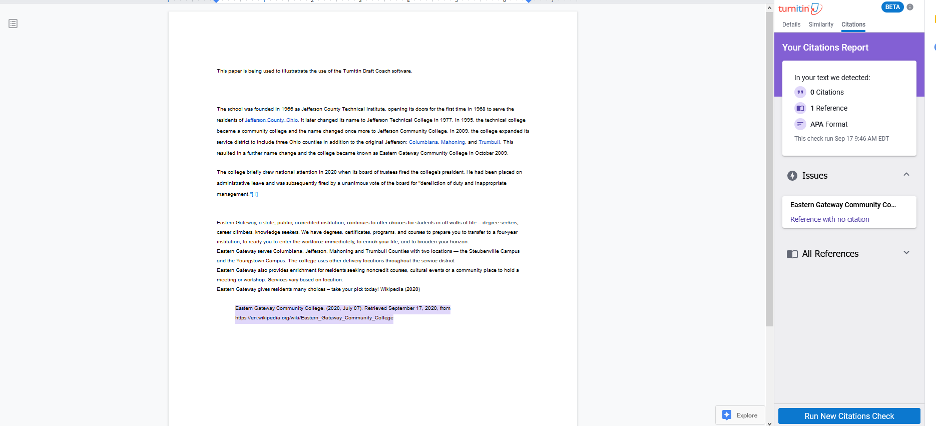 The Citations tab can be used to check Citations. This will display any issues seen.