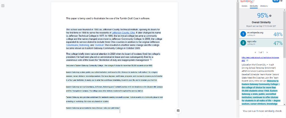 Wait for the similarity report to give the results. The results will show the percentage in the Turnitin panel on the right. Clicking on the individual results will show where the information was found.