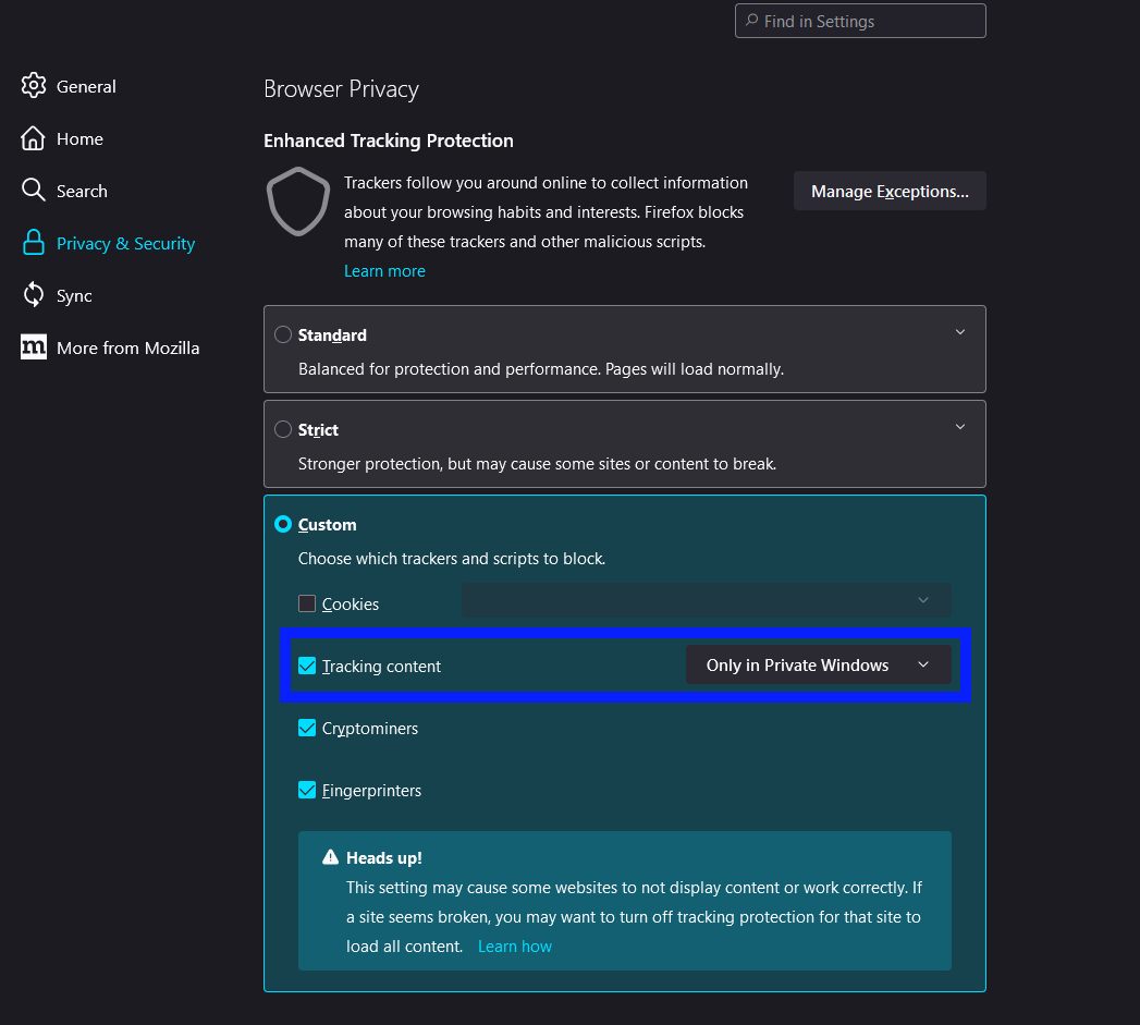 After, click on the Privacy and Security tab on the left side, and set your Browser Privacy policy to at least have Tracking Content set to 'Only in Private Windows.' The rest of the settings are up to you, but changing this setting will fix any cross-site issues you may have while browsing your course.