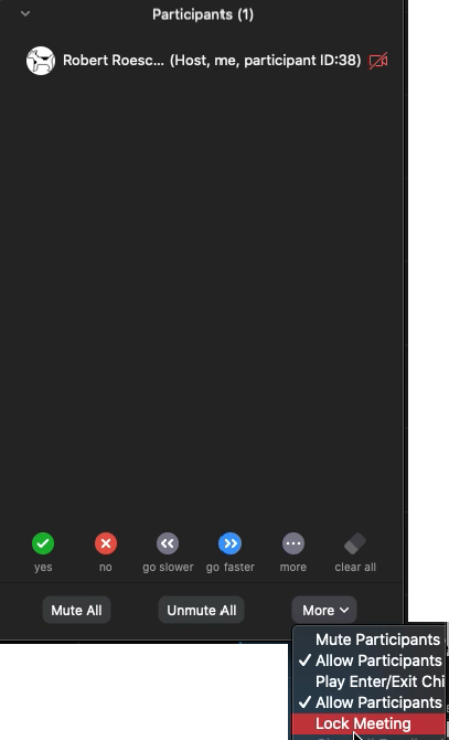 Once you meeting has started and all participants have arrived, from the participants window, click the More button in the bottom right corner, and select Lock Meeting as shown below.