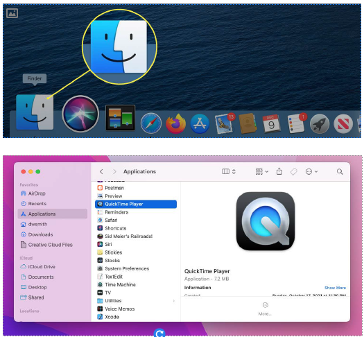 Step 1: Find and open the QuickTime application in the Macintosh HD/Applications folder. You can find this folder by clicking on the 'Finder' icon from the Dock bar at the bottom of your desktop window and click the Applications Folder in the left-side panel.
