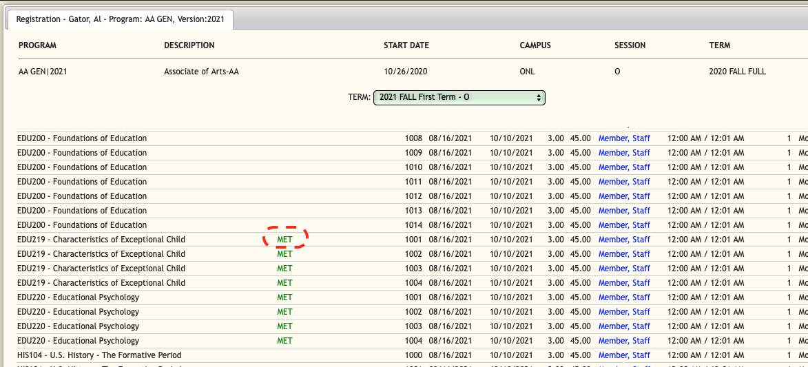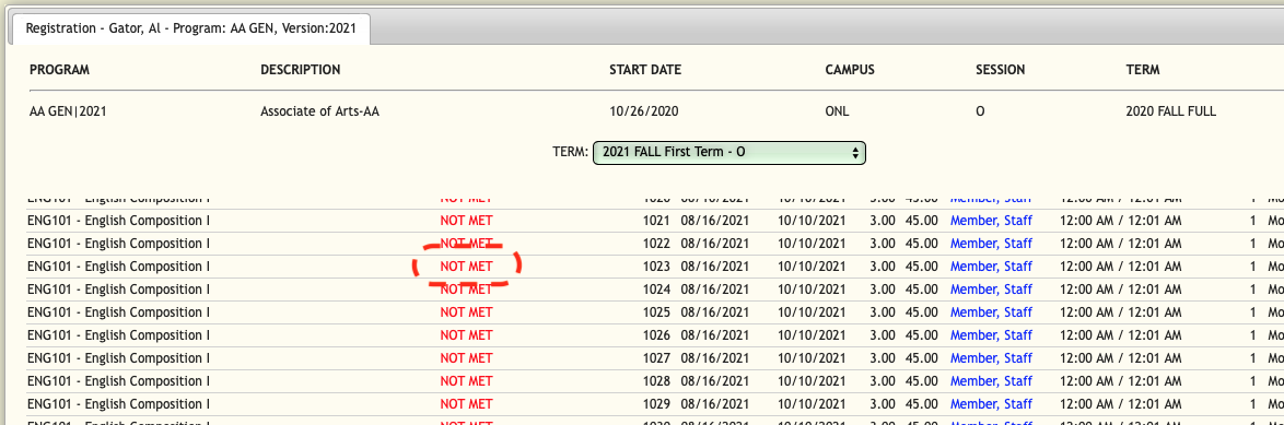When registering for courses, you may see either "MET" or "NOT MET" listed next to a particular course. These labels denote the status of pre-requisites that are required to register for that particular course.