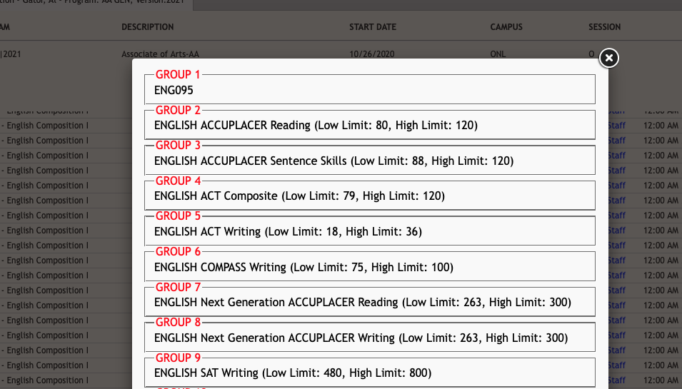 When you see a course that has the label of "NOT MET", you can click on that label and view the specific pre-requisites that you need to have to be able to register for the course. For example, to register for ENG101, you must meet ONE of the following pre-requisite test scores.