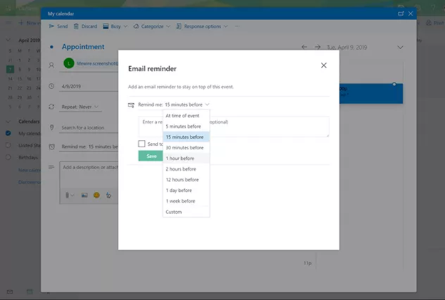 Open the Remind me dropdown, and choose when you want an email reminder to be sent for this event.