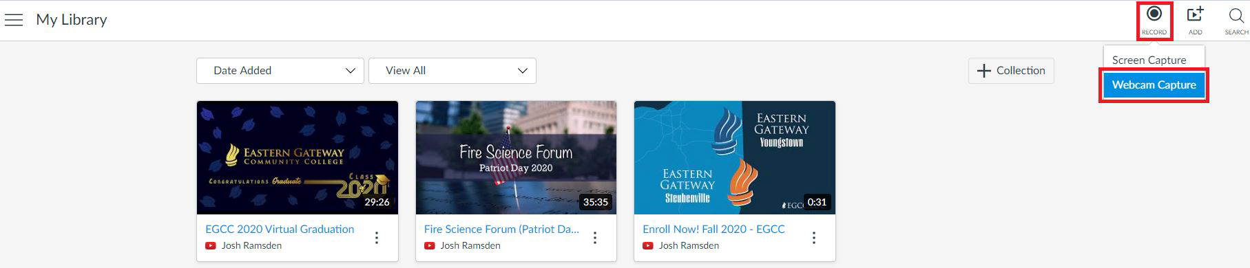 Step 2: Click on the "Record" icon in the upper right side of the page. Then select the "Webcam Capture" link.