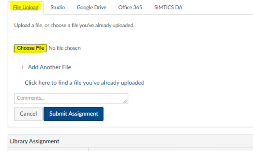 Once you have the PDF downloaded, go to the "Introduction to the Library Assignment" assignment page in your course. Once you are there, click the blue "Start Assignment" button in the top right hand corner. Under "File Upload" click "Choose File."