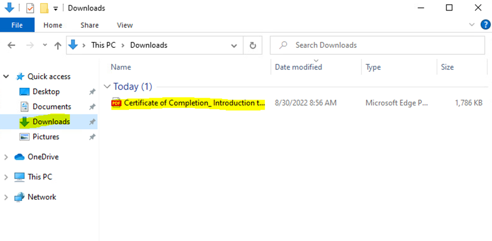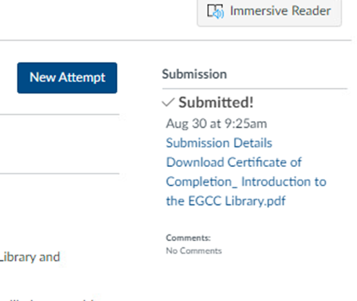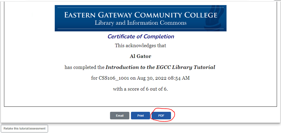 First, complete the "Introduction to the Library" tutorial. Once you complete all questions, you will be taken to a screen showing your score and certificate of completion. On this page, click the blue "PDF" button at the bottom of the page. This will download the PDF to your computer. You will need to upload this later.