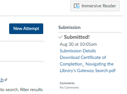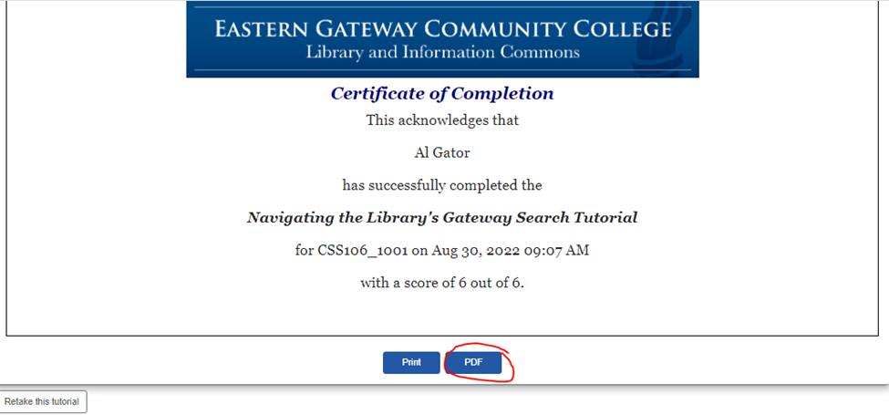 You will use the same steps for the next assignment - Navigating the Library's Gateway Search Assignment. Complete the "Navigating the Library's Gateway Search" tutorial. Once you complete all questions, you will be taken to a screen showing your score and certificate of completion. On this page, click the blue "PDF" button at the bottom of the page. This will download the PDF to your computer. You will need to upload this for the second assignment.